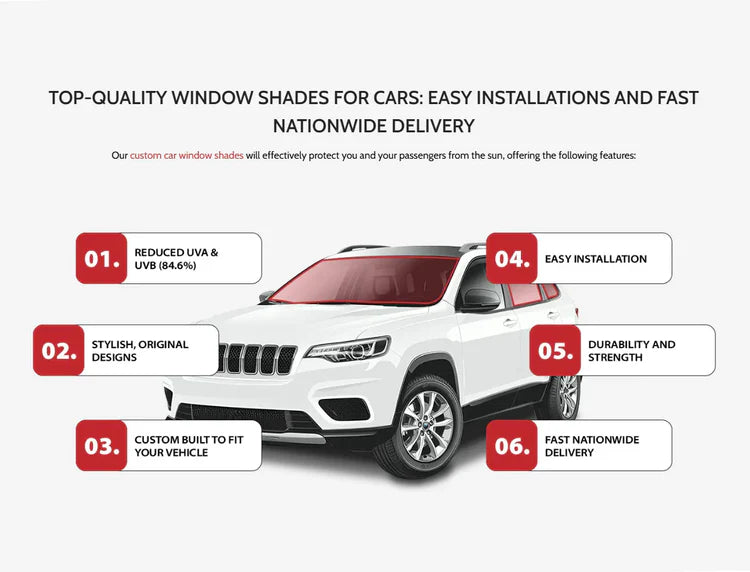 Our custom car window shades will effectively protect you and your passengers from the sun, offering the following features